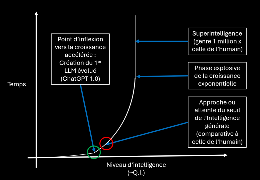 Pour ce qui est de l’intelligence artificielle, je m’éduque sur le sujet depuis longtemps (par la lecture de nombreux livres ainsi que de publications en-lignes) et, depuis plus de 15 ans, je partage avec mon entourage les prédictions de l’arrivée prochaine (que j’avais alors prévu pour 2025-2035) de la singularité (La singularité est le point hypothétique dans le futur où le développement technologique, notamment l’intelligence artificielle, s’accélère de façon exponentielle, dépassant la compréhension humaine et transformant radicalement la société). Quand je leur parlais de l’IA et de singularité il y a 10 ans, mon entourage professionnel me répondait qu’ils n’avaient aucune idée de quoi je parlais, et semblaient peu intéressé. Je ne suis pas Ray Kurzweil, mais disons que j’ai pas mal toujours prédit quelles et quand seraient les grandes technologies émergentes – simplement par logique, en considérant leur impact possible ainsi que le taux d’avancement de la science et des capacités technologiques actuelles.